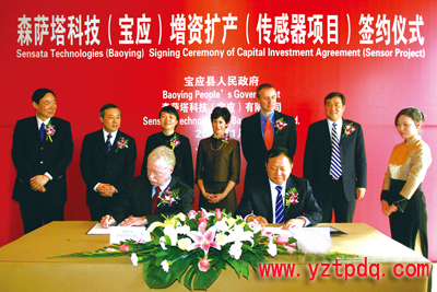 1月19日中午,美國森薩塔科技公司在揚(yáng)州與我縣簽訂增資擴(kuò)產(chǎn)協(xié)議,市委書記、市人大常委會主任王燕文,市委副書記、市長謝正義,副市長聞道才,森薩塔科技總裁兼首席運(yùn)營官瑪莎·蘇利文女士,森薩塔科技執(zhí)行副總裁、首席財務(wù)官杰夫·科特先生,森薩塔科技運(yùn)營高級副總裁迪克·丁先生,縣委書記、縣人大常委會主任仲生,縣委副書記、縣長王庭國,縣委副書記周玉寶,副縣長顧長榮以及市經(jīng)信委、商務(wù)局、質(zhì)監(jiān)局、海關(guān)、商檢局和我縣相關(guān)負(fù)責(zé)人等出席簽約儀式。