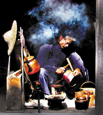 老揚州人家都喜歡銅器,那時候,一般家庭所使用的器皿都離不開銅器,婚嫁時必備兩個銅盆,子孫滿月又要送個銅盆、一雙銅筷子,父母過六十大壽,子女照例會送上一個銅盆,寓意父母金盆洗手可以享清福了。以前揚州一帶人家以擁有銅器為榮,使用銅器多的便是大戶人家。但到了“大躍進”大煉鋼鐵時,人們紛紛把銅器捐了出來,銅器從此在日常生活中“淡出”,銅器鋪相繼關門,可銅匠擔仍然活躍在街頭巷尾。