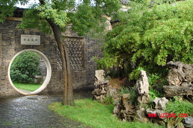 "小苑春深"與"迎曦"兩苑中間有漢白玉月洞門(mén),兩邊有各式水磨磚細(xì)花漏窗分隔東西兩園,隔景透景合而為一。站在月門(mén)前東望小苑景色,石峰崛起,古柏參天,石榴枝繁葉茂如蓋張。高聳青灰絲縫云山式墻頂如游龍。西看小苑,曲廊幽榭,花廳書(shū)齋,牡丹臺(tái)上翠竹千竿,花木扶疏,書(shū)齋窗前,百年石榴老干如龍蛇走。