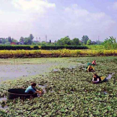 每當(dāng)秋季,邵伯鎮(zhèn)大小湖塘的水面上,全是碧綠一片,只見“叢叢菱葉隨波起,朵朵菱花背日開”,像是鋪了一層翡翠,密密匝匝,簇簇?fù)頁?。采菱女漫身在木盆中,紅衣綠葉,暖風(fēng)美喉,如在畫中游動。只見,遠(yuǎn)處,碧波一湯漾,飛蜓野荷;岸上,壟田阡陌,煙村疏林;近旁,青菱白花,搖曵生姿,構(gòu)成了一幅秋日特有的旖旎圖畫,成了邵伯一道亮麗的風(fēng)景線。